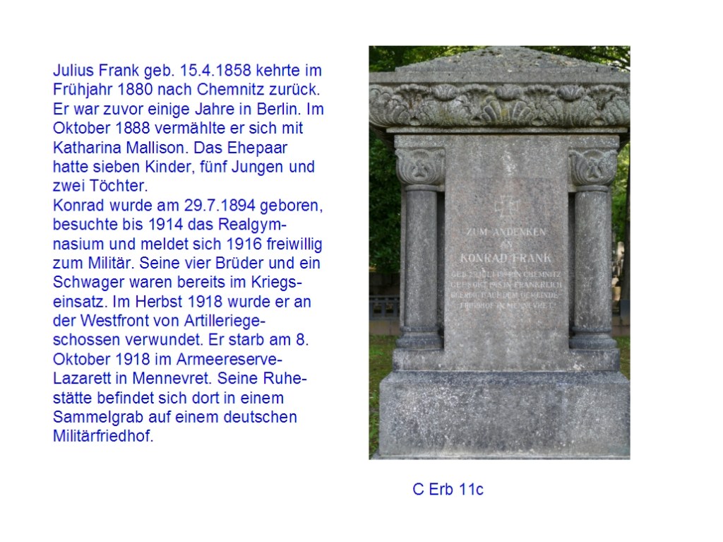 - Quellen: „Juden in Chemnitz“ Fam. Jakob Kupferberg S.392, Fam. Abraham Dresel S.356, Fam. Georg Mecklenburg S.341, Fam. Goeritz S. 364-367, Fam. Weiner 432 + 175, Fam. Julius und Konrad Frank S. 360-362, Fam. Wilhelm Sachs S.420, Gabriel Cohn S.97-102