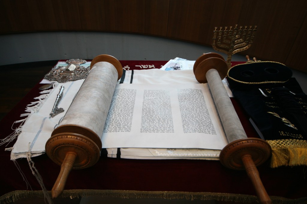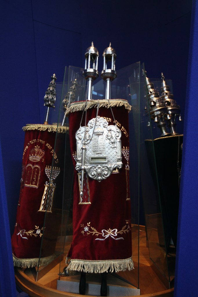 Die Tora ist bekleidet mit einem Mäntelchen, Schild , dem Jad